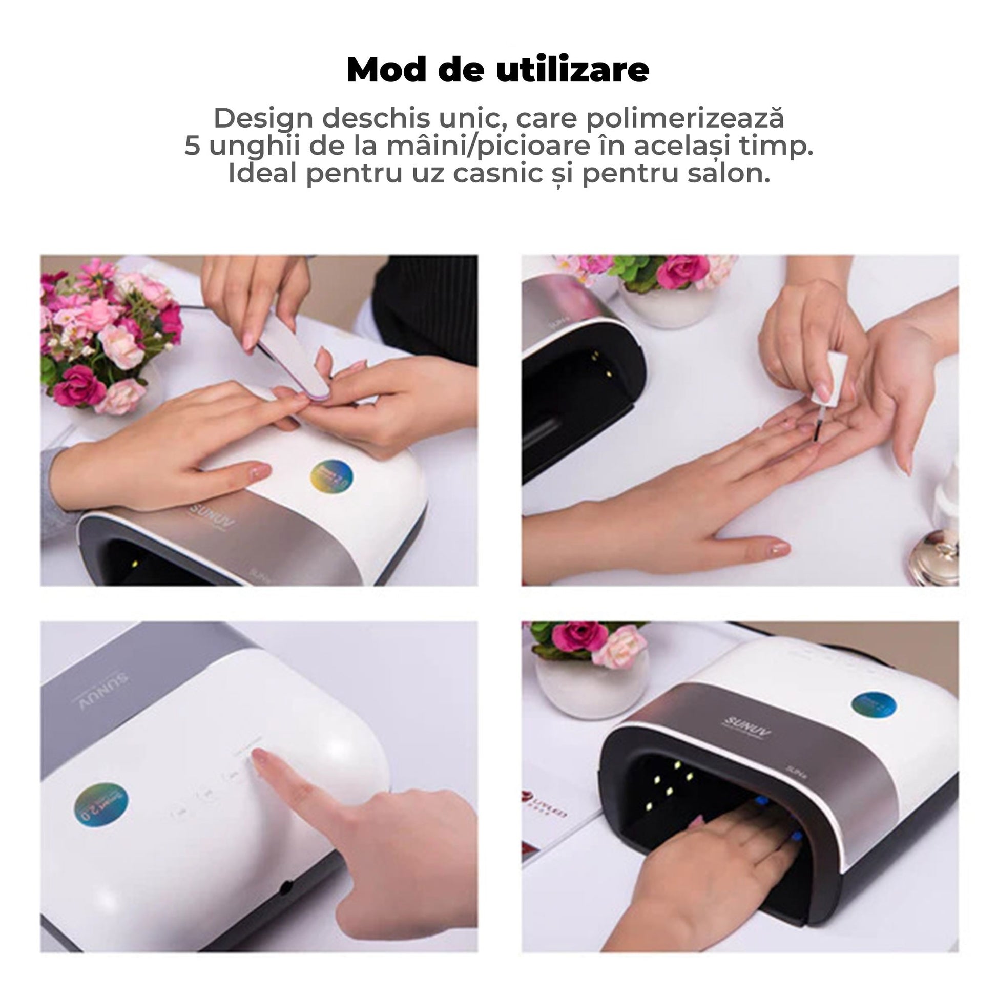 Este ideală, atât acasă, cât și la salon. Durata de viață a celor 39 de LED-uri este de 50000h. Forma încăpătoare a acesteia face lucrul mai ușor, având destul spațiu pentru a polimeriza 5 unghii simultan, atât în cazul pedichiurii, cât și în cazul manichiurii. Comparativ cu lampa de unghii cu lumină violetă tradițională, aceste lumini albe moi nu dăunează ochilor. Designul exterior al lămpii combină metalul mat și plasticul alb, iar în interiorul lămpii există un strat întunecat. O astfel de soluție contrastantă în culori și materiale oferă un aspect solid, pe care profesioniștii îl vor aprecia, precum și funcționalitatea unei baze detașabile din plastic. Pe lângă asta, lampa dispune în partea frontală și de un display digital cu temporizator.