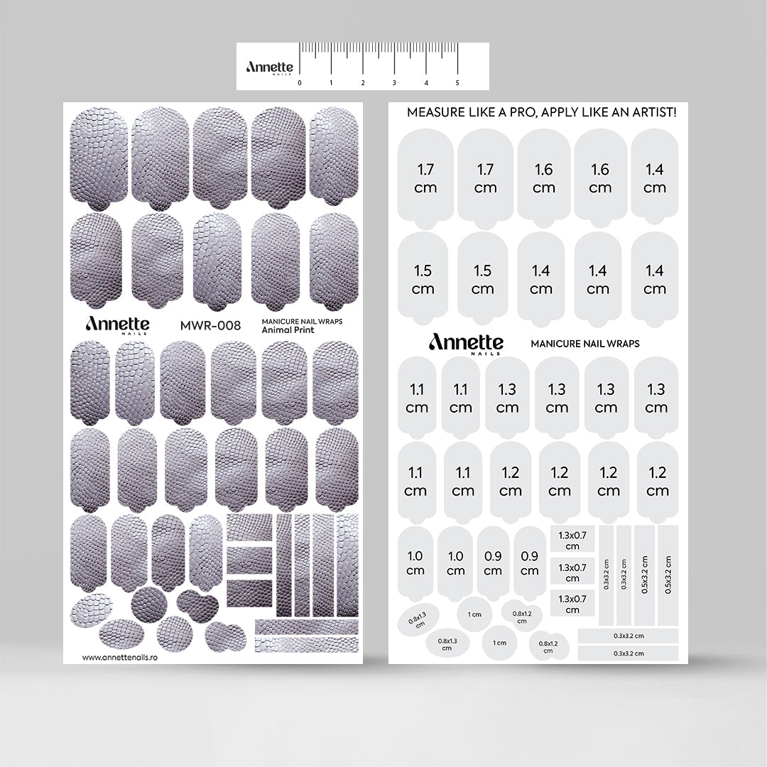 MWR-008 din colecția Nail Wraps Animal Print Annette Nails ilustrează textura autentică a pielii de șarpe, reinterpretată în nuanțe fine de violet. Fiecare wrap are un design individual, care se combină armonios cu celelalte, conturând un look fluid și echilibrat. În plus, pachetul conține decorațiuni care îți oferă libertatea de a adăuga accente originale și de a personaliza fiecare manichiură. Combinația cromatică între nuanțele delicate de violet oferă un efect fin și elegant, accentuând fiecare detaliu al designului, pentru un efect vizual memorabil.