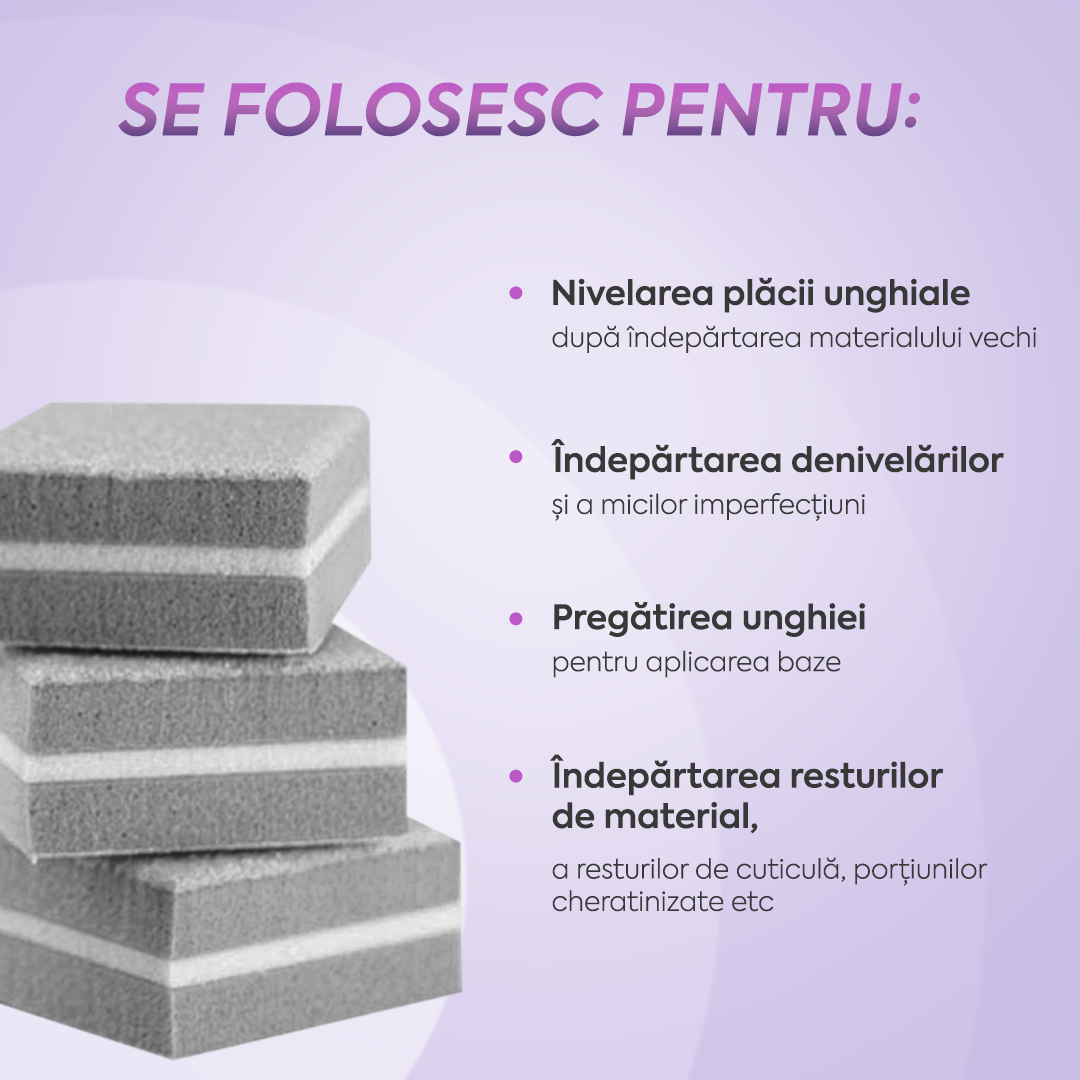 Abrazivitatea de 100 grit este ideală pentru șlefuirea suprafeței unghiei tehnice, îndepărtarea denivelărilor și corecțiile după îndepărtarea stratului vechi de produs.