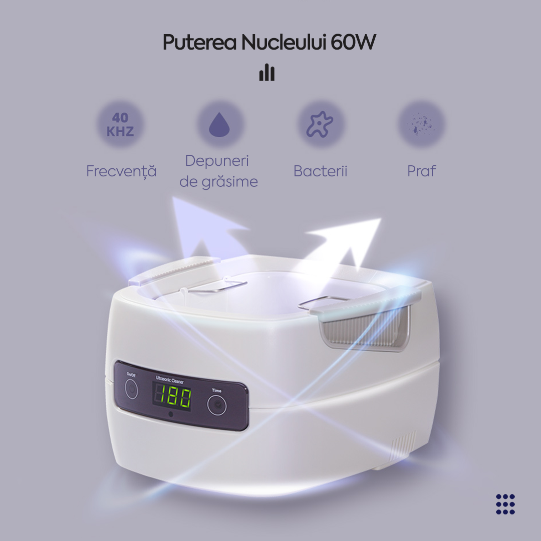 Aparat de curățare cu ultrasunete CODYSON CD-4801, 1400 ml pentru curățare presterilizare. Vasul de curățare este fabricat din oțel inoxidabil. Volumul vasului este de 1400 ml (volumul maxim pentru  lichide - 1100 ml). Control digital și display LED. Temporizator: 1,5 minute, 3 minute, 4,5 minute, 6 minute, 8 minute. Dimensiunile vasului de curățare sunt 23.0 x 18.5 x 16.0 cm. Greutatea este de 1.70 kg. Această versiune are integrat un transductor ultrasonic - clasă industrială, cu un sistem de răcire ceea ce-l face potrivit pentru funcționarea continuă și îi asigură o durată de viață de două ori mai mare comparativ cu modelele obișnuite.