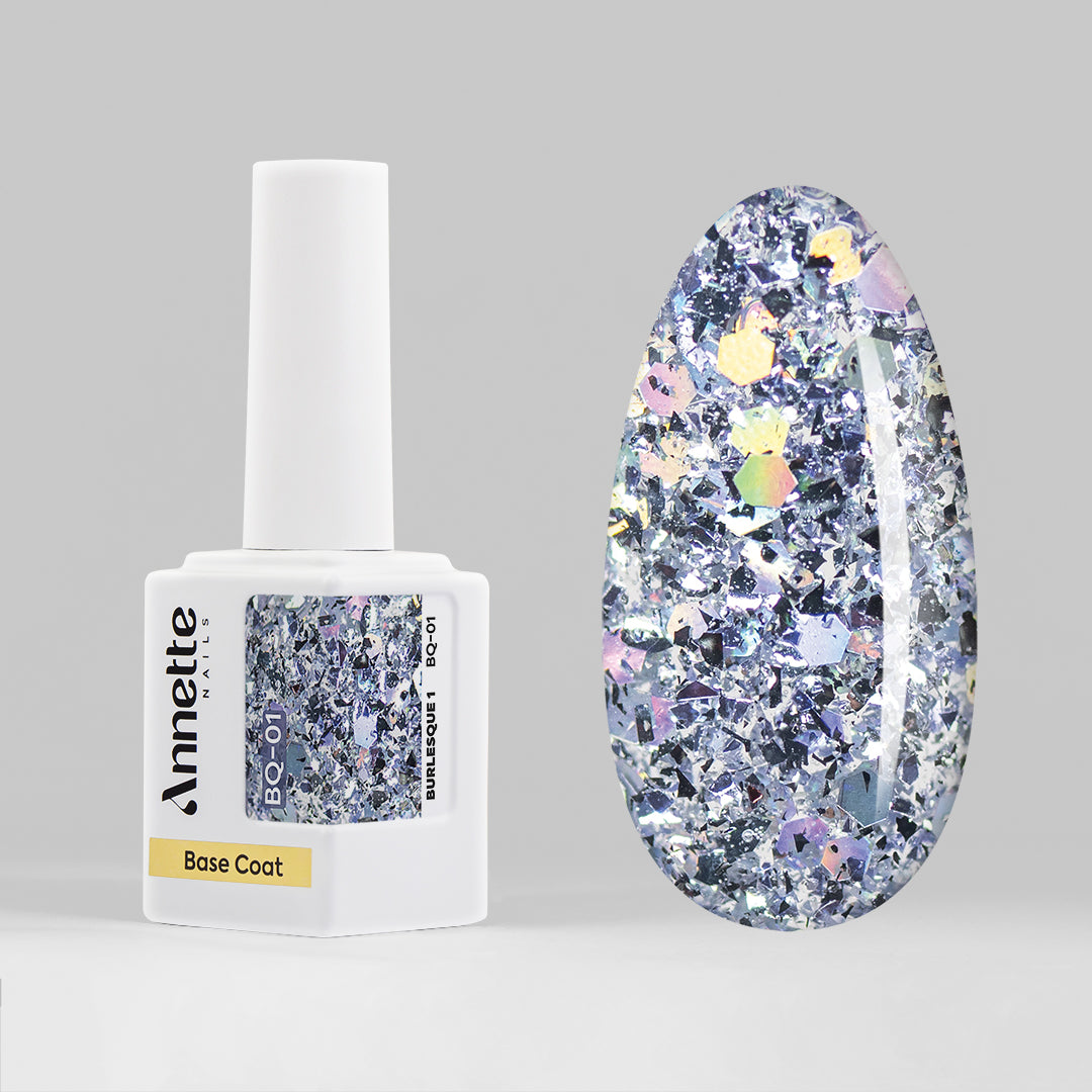 Colecția de Baze Rubber Burlesque Annette Nails este compusă din 6 baze autonivelante colorate, cu o concentrație mare de paiete reflectorizante și fulgi metalici. Colecția este concepută pentru a oferi un look sofisticat și festiv unghiilor, reflectând lumina din diverse unghiuri și creând un efect spectaculos de sclipire, asemenea unui show adevărat de cabaret.