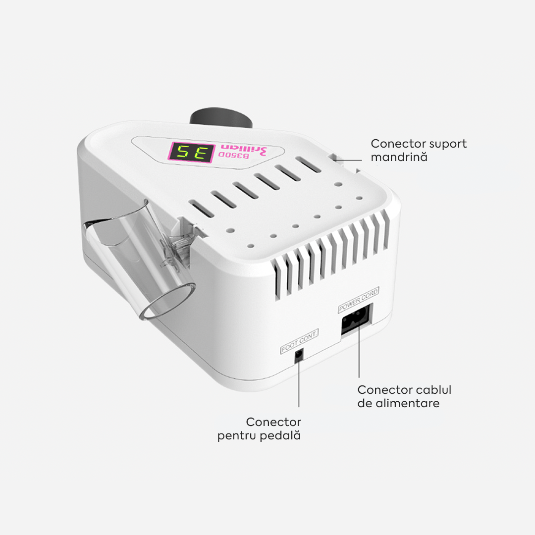 • Mandrină H350 cu cuplu mare – oferă o turație de până la 35.000 RPM și un cuplu de 3.0 Ncm, suficient de puternic pentru procedurile de manichiură și pedichiură, dar fără a compromite confortul;
