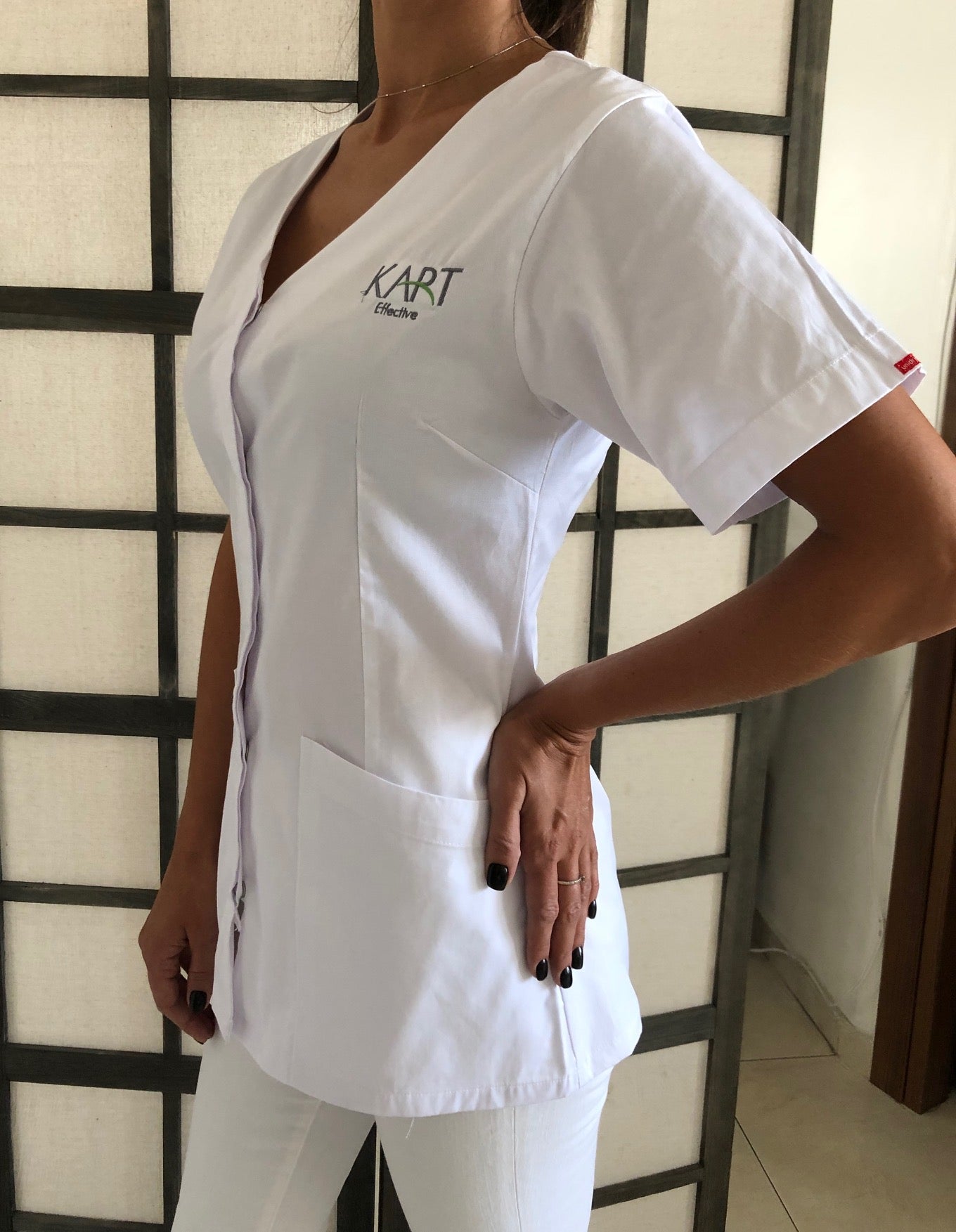 Halat confortabil și practic pentru tehnicienii de manichiură și pedichiură, cu logo-ul KART.Este realizat dintr-un material durabil, respirabil, care nu provoacă disconfort în timpul lucrului. Țesătura este folosită în croitoria îmbrăcămintei medicale. Suprafața exterioară este netedă și rezistentă la contaminare. Componenta sa din bumbac oferă senzația de confort. Țesătura medicală suportă bine spălările multiple/regulate (sterilizarea), își păstrează culoarea și nu necesită îngrijire specială. Articolul este rezistent la șifonare și este ușor de călcat, păstrându-și aspectul o perioadă îndelungată.