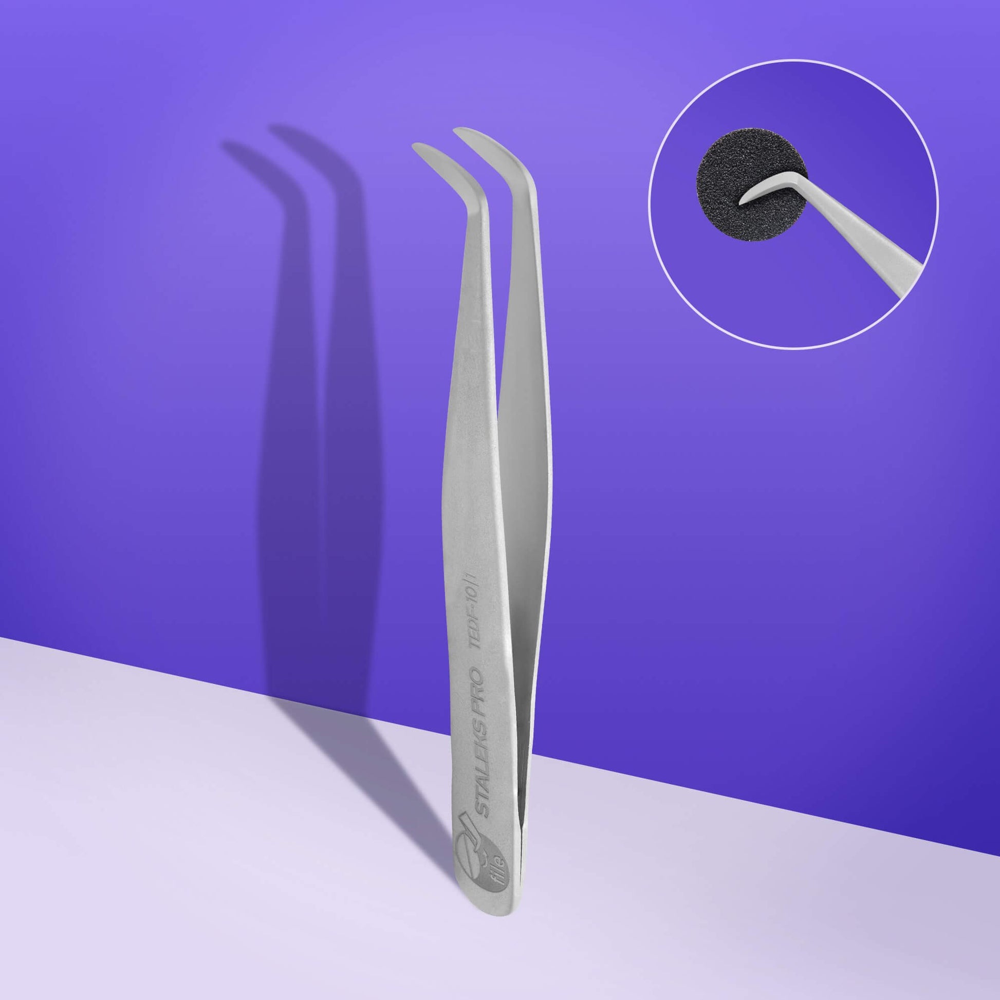 Penseta expert TEDF-10/1 este fabricată din oțel inoxidabil 40X13, ceea ce îi certifică calitatea. Separare ușoară și convenabilă a căptușelii de protecție pe abrazivele de unică folosință pentru pile și pododiscuri. Învelișul mat anti-alunecare permite fixarea confortabilă a pensetei în mâna tehnicianului în timpul lucrului. Suprafețele de lucru lustruite nu dăunează genelor și împiedică aderența lipiciului.