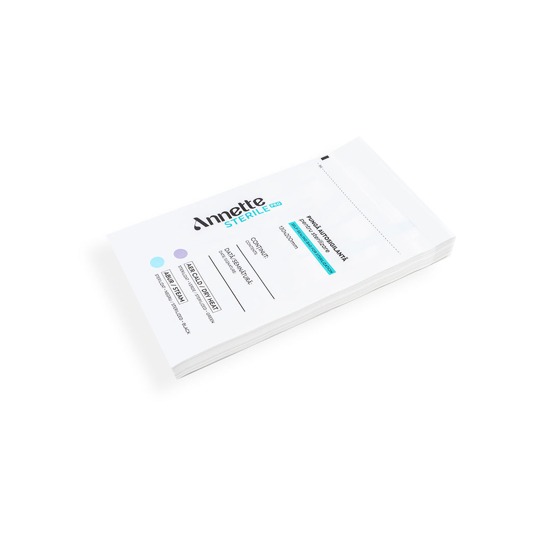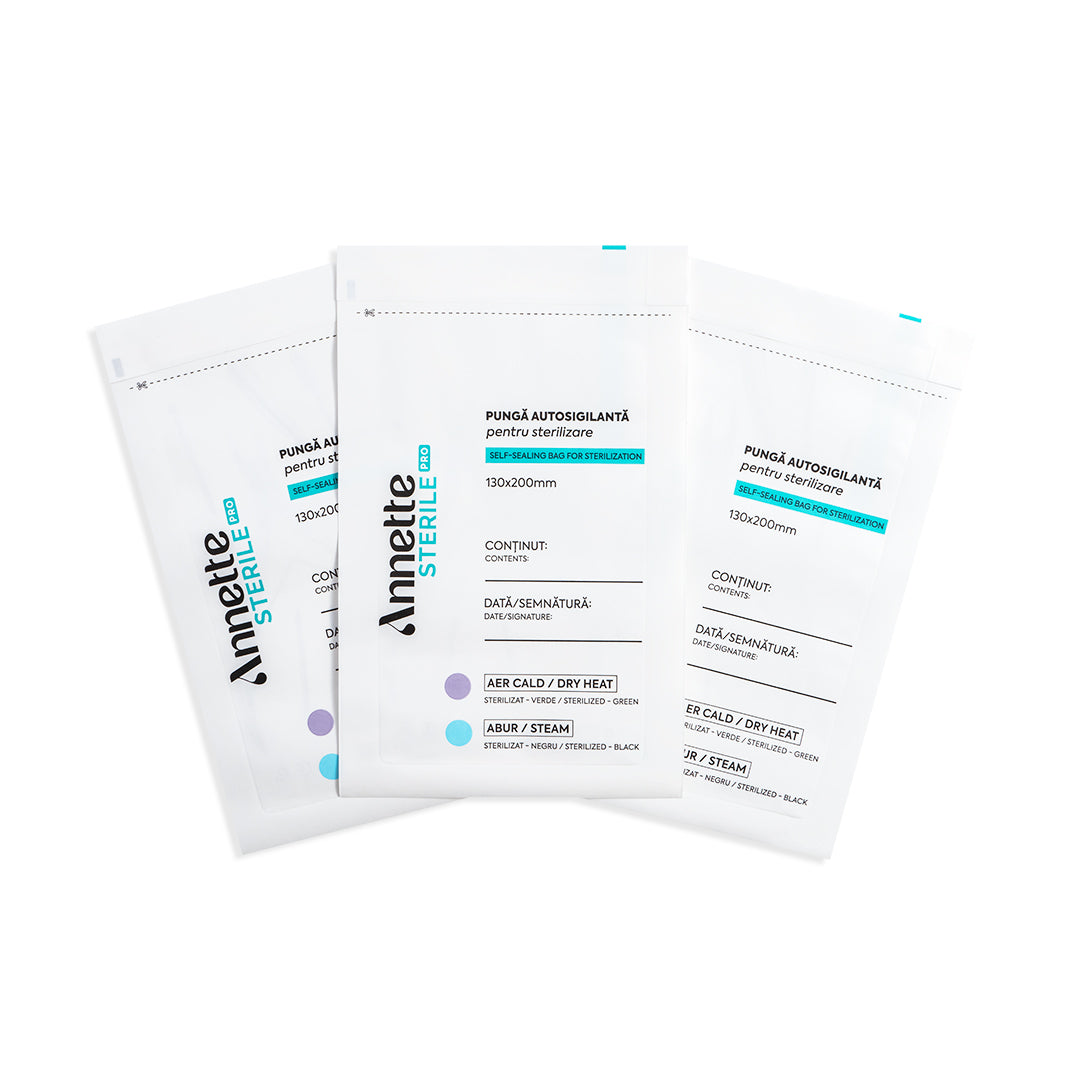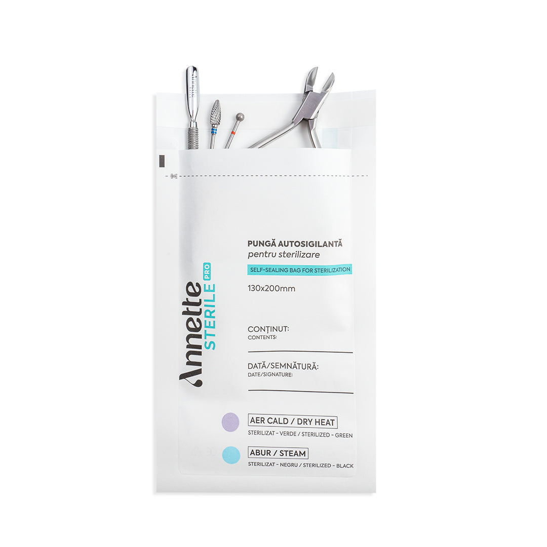 Pungile Annette Sterile Pro cu dimensiunile de 130 x 200 mm sunt încăpătoare și permit sterilizarea oricărui set de instrumente, de la pushere, capete de freze și forfecuțe, până la chiurete, spatule, clești pentru pedichiură și despărțitoare de degete. În plus, acestea sunt practice, nu se rup și asigură protecția instrumentelor în timpul transportului și depozitării. După sterilizare pungile asigură o protecție eficientă de 1-2 luni (pupinel/autoclav) împotriva contaminărilor chimice și biologice ale instrumentelor, reprezentând un produs esențial în trusa fiecărui tehnician. Odată folosite, pungile nu mai pot fi reutilizate.