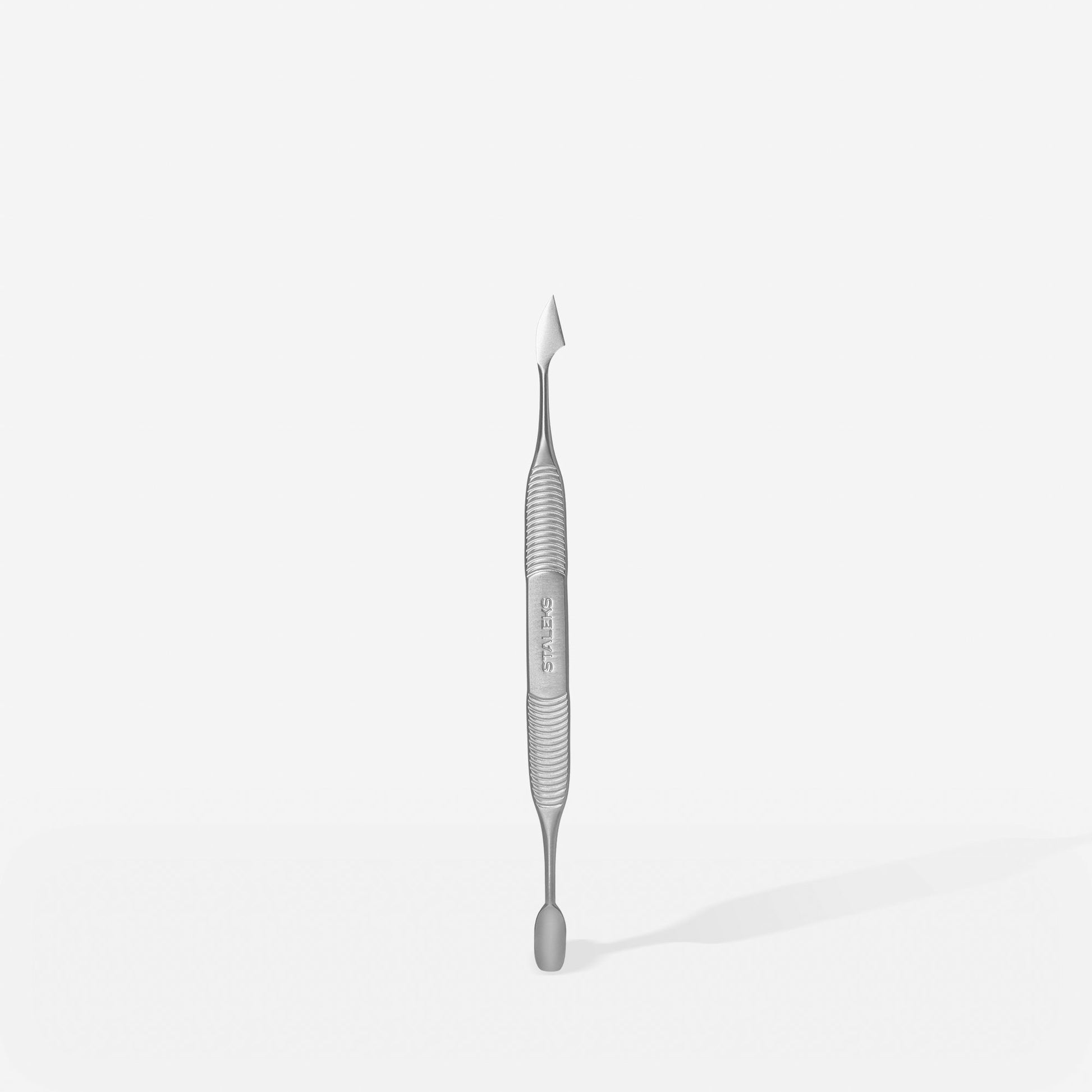 Pusherul este utilizat pentru a împinge cuticula și pentru a îndepărta resturile de cuticulă în timpul procedurii de pedichiură.Acesta are suprafață nichelată, mâner reiat, ce dispune de o formă ergonomică care facilitează uzul intens.
