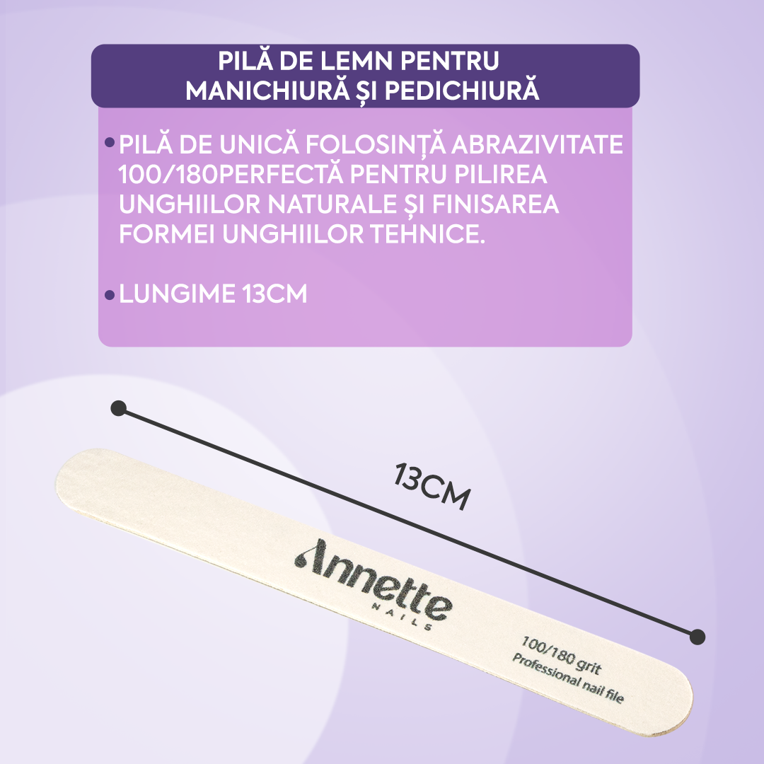 Pilă Annette Nails cu granulația 100/180 grit - se poate folosi atât pentru pilirea unghiilor naturale, cât și pentru cele false. Pila poate fi folosită atât de tehnicienii profesioniști, cât și pentru uzul la domiciliu. Pila este realizată din materiale de calitate, ceea ce îi asigură o structură durabilă și rezistentă la uzură.
